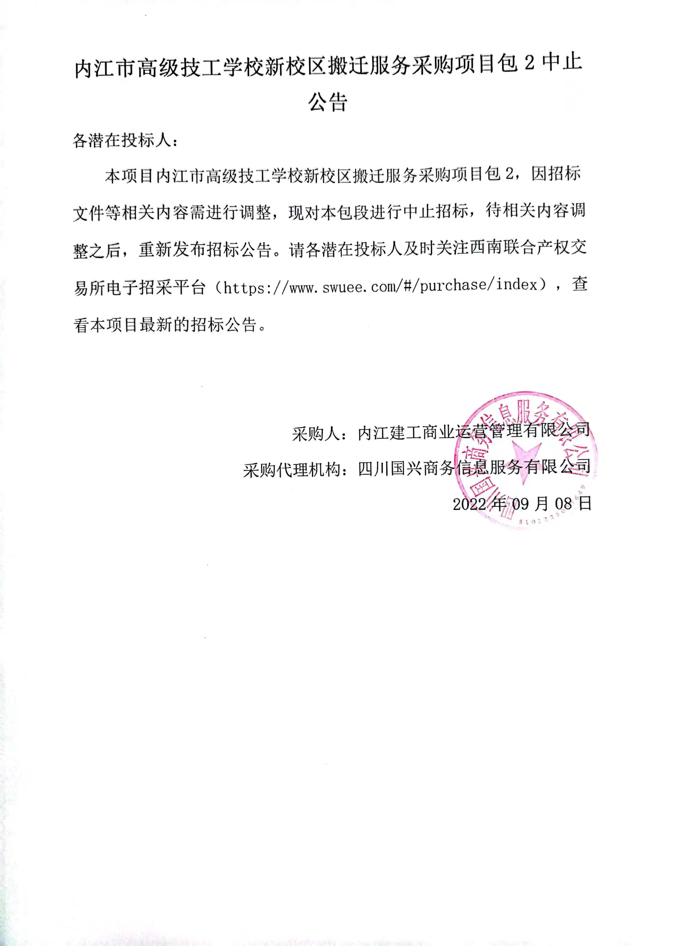 本項(xiàng)目?jī)?nèi)江市高級(jí)技工學(xué)校新校區(qū)搬遷服務(wù)采購(gòu)項(xiàng)目包2,因招標(biāo)文件等相關(guān)內(nèi)容需進(jìn)行調(diào)整,現(xiàn)對(duì)本包段進(jìn)行中止招標(biāo),待相關(guān)內(nèi)容調(diào)整之后,重新發(fā)布招標(biāo)公告。請(qǐng)各潛在投標(biāo)人及時(shí)關(guān)注西南聯(lián)合產(chǎn)權(quán)交易所電子招采平臺(tái)(https://www.swuee.com/#/purchase/index),查看本項(xiàng)目最新的招標(biāo)公告。