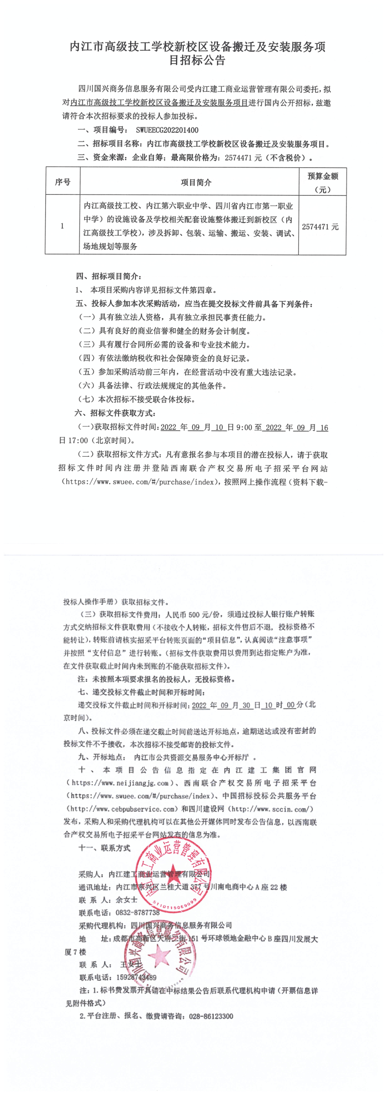 四川國興商務(wù)信息服務(wù)有限公司受內(nèi)江建工商業(yè)運營管理有限公司委托,擬對內(nèi)江市高級技工學(xué)校新校區(qū)設(shè)備搬遷及安裝服務(wù)項目進行國內(nèi)公開招標,茲邀請符合本次招標要求的投標人參加投標。
