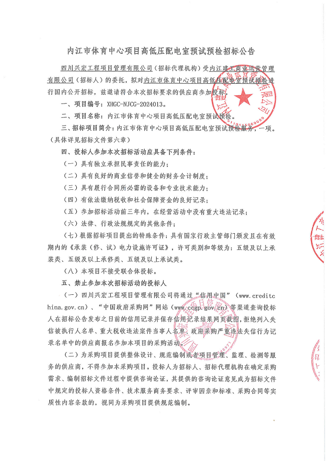 內(nèi)江市體育中心項(xiàng)目高低壓配電室預(yù)試預(yù)檢招標(biāo)公告