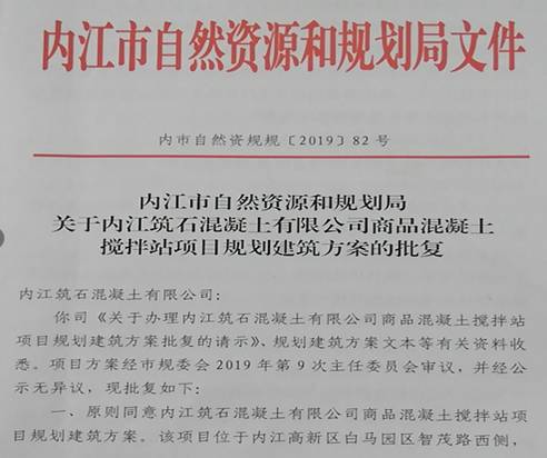 從9月開始,我司積極準備《建設工程規(guī)劃許可證》申請的相關材料。9月23日,我司向內(nèi)江市自然資源和規(guī)劃局提交申請材料,10月16日獲取內(nèi)江筑石混凝土有限公司商品混凝土攪拌站項目規(guī)劃建筑方案的批復和《建設工程規(guī)劃許可證》,為新站建設取得另一張關卡通行證。